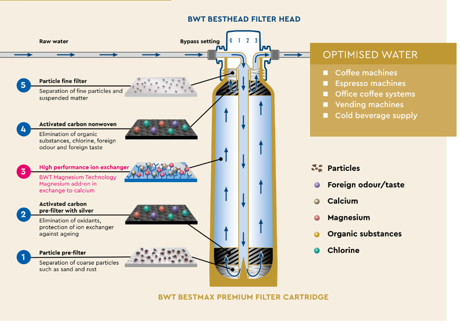 BWT bestmax PREMIUM on filtrisüsteem, mille abil saate toota gurmeevett, mis sobib kohv, espresso ja tee valmistamiseks. Modulaarne multi- etapi filter kasutab patenteeritud BWT Magnesium Tehnoloogiat, mis samuti mineraliseerib magneesiumiga. Filtrisüsteem koosneb BWT peaga filtrikassetist, mis on peale keeratud. Segu  (0–3) on seatud filtripeale sõltuvalt vee karedusest ja nõuetest. Filtripeas olevad tagasilöögiklapid takistavad tagasivoolu ja kontrollimatu vee väljavool. BWT bestmax PREMIUM toidukindel filter süsteemid on survekindlad ja ohutud. Neid saab kasutada kogu maailmas mis tahes joogiveesüsteemis.